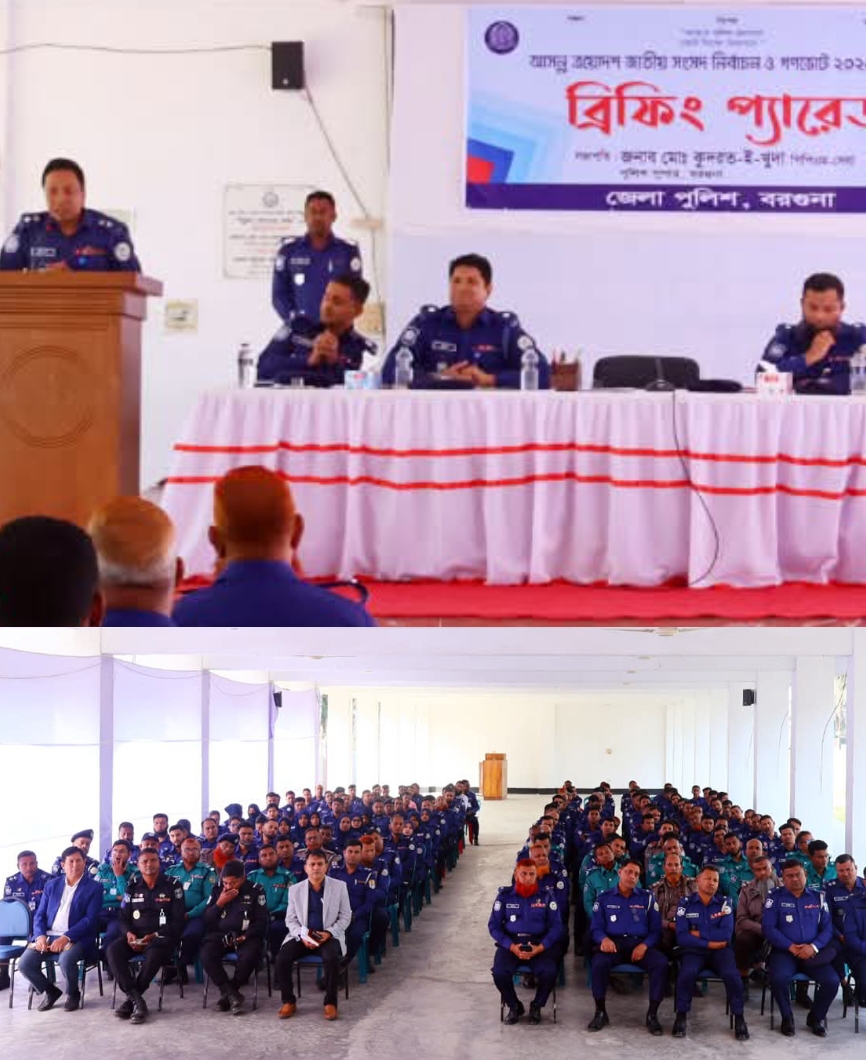 ত্রয়োদশ জাতীয় সংসদ নির্বাচন ও গণভোট উপলক্ষে বরগুনায় পুলিশ সুপারের ব্রিফিং প্যারেড অনুষ্ঠিত